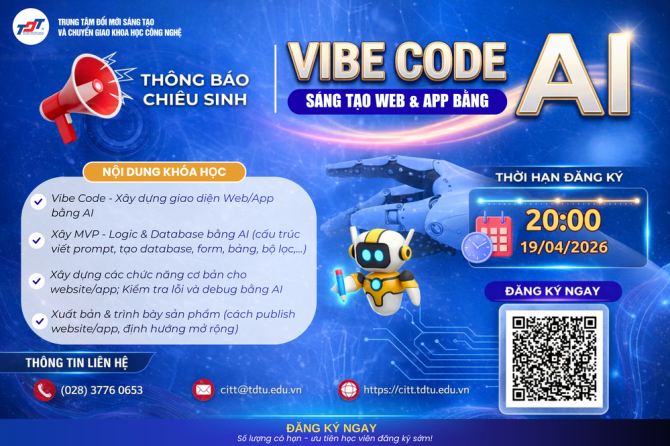 Khóa học Khóa học | 16/04/26 Thông báo chiêu sinh khóa học “Ứng dụng Trí tuệ nhân tạo (AI) trong học tập và nghiên cứu khoa học”_K02.2026 Khóa học | 06/04/26 Khóa học “AI - Trợ lý thông minh cho nhân viên văn phòng Khóa học | 25/03/26 Khóa học trực tuyến "VIBE CODE AI - Sáng tạo Web & App trên nền tảng AI" Xem chi tiết