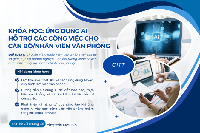 Khóa học Khóa học | 04/09/2025 Khóa học "Ứng dụng Canva và AI xây dựng phương pháp dạy học chủ động" Khóa học | 01/09/2025 Khóa học: Ứng dụng AI trong viết khóa luận, tiểu luận Khóa học | 01/09/2025 Khóa học: Ứng dụng AI và các công nghệ tích hợp vào Hoạt động Nghiên cứu khoa học Khóa học | 01/09/2025 Khóa học: Ứng dụng AI hỗ trợ các công việc cho cán bộ/nhân viên văn phòng