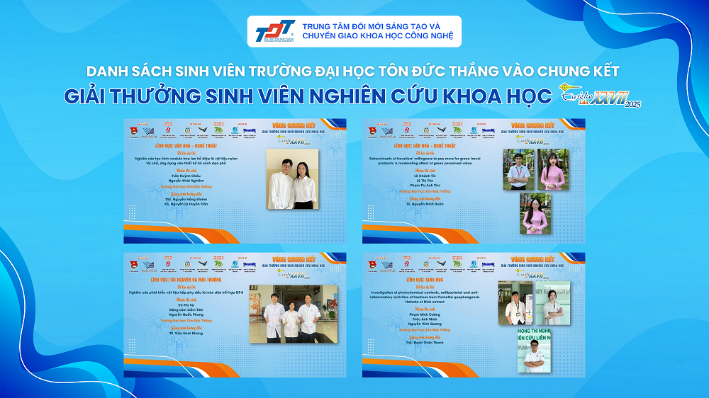 Vượt qua hàng nghìn đề tài chất lượng cao đến từ nhiều cơ sở đào tạo uy tín, các nhóm sinh viên TDTU đã thể hiện rõ bản lĩnh nghiên cứu, tư duy sáng tạo và khả năng gắn kết giữa lý luận với thực tiễn. Kết quả chung cuộc, đoàn sinh viên TDTU đã xuất sắc mang về 04 giải thưởng tại các lĩnh vực Sinh học; Tài nguyên và Môi trường; Văn hóa - Nghệ thuật, cụ thể: